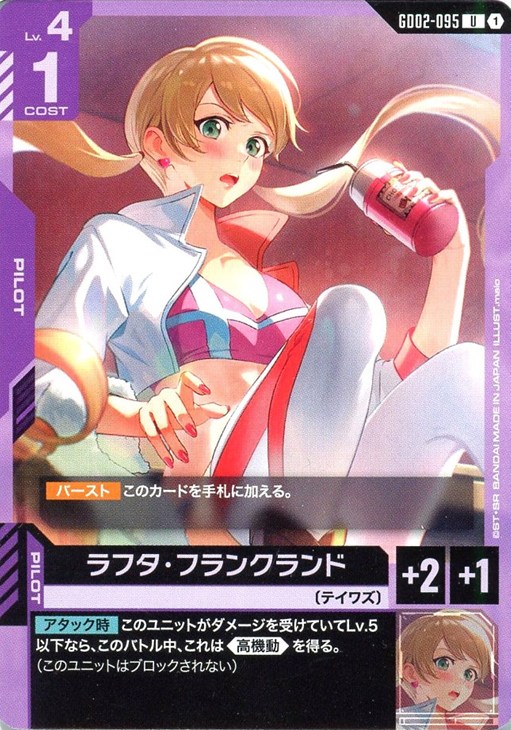 【バースト】このカードを手札に加える。【アタック時】このユニットがダメージを受けていてLv.5以下なら、このバトル中、これは《高機動》を得る。(このユニットはブロックされない)