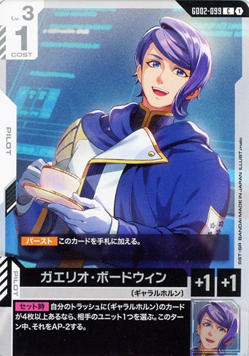 - 【バースト】このカードを手札に加える。【セット時】自分のトラッシュに〔ギャラルホルン〕のカードが4枚以上あるなら、相手のユニット1つを選ぶ。このターン中、それをAP-2する。