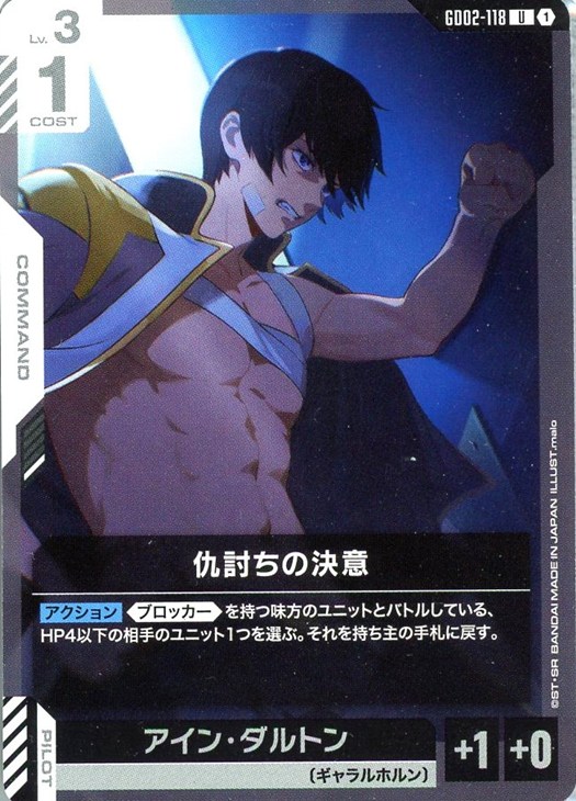 - 【アクション】《ブロッカー》を持つ味方のユニットとバトルしている、HP4以下の相手のユニット1つを選ぶ。それを持ち主の手札に戻す。【パイロット】「アイン・ダルトン」