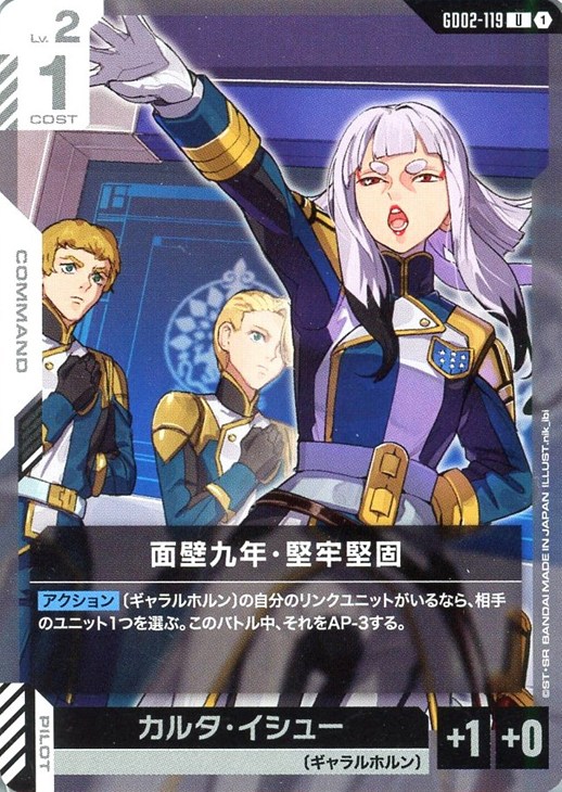 - 【アクション】〔ギャラルホルン〕の自分のリンクユニットがいるなら、相手のユニット1つを選ぶ。このバトル中、それをAP-3する。【パイロット】「カルタ・イシュー」