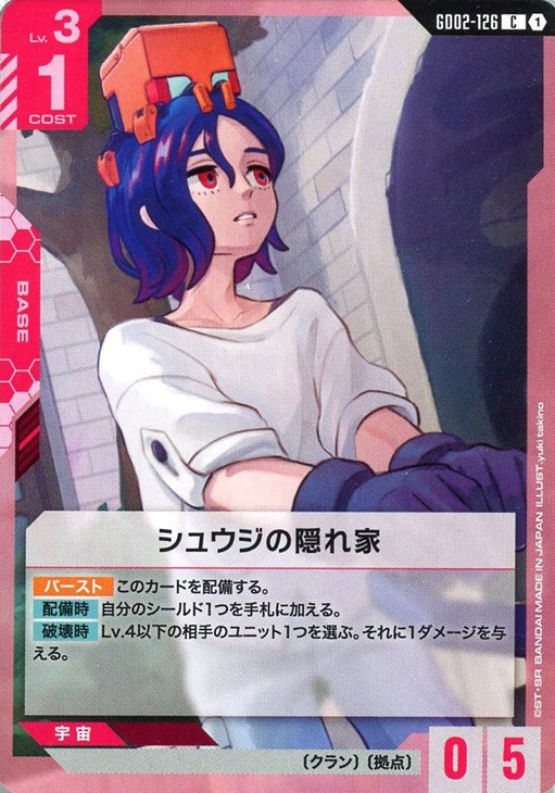 - 【バースト】このカードを配備する。【配備時】自分のシールド1つを手札に加える。【破壊時】Lv.4以下の相手のユニット1つを選ぶ。それに1ダメージを与える。