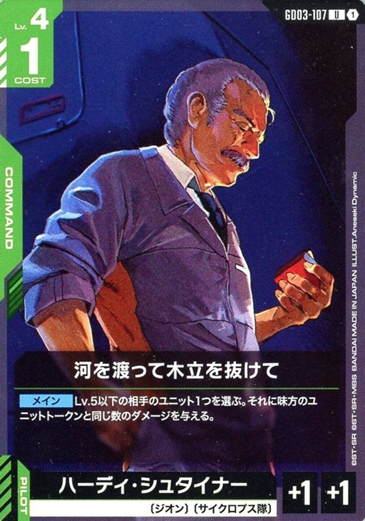- 【メイン】Lv.5以下の相手のユニット1つを選ぶ。それに味方のユニットトークンと同じ数のダメージを与える。【パイロット】「ハーディ・シュタイナー」