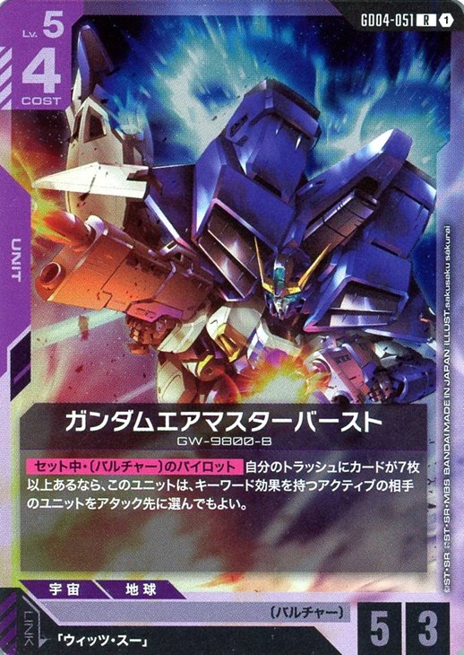 - 【セット中・〔バルチャー〕のパイロット】自分のトラッシュにカードが7枚以上あるなら、このユニットは、キーワード効果を持つアクティブの相手のユニットをアタック先に選んでもよい。