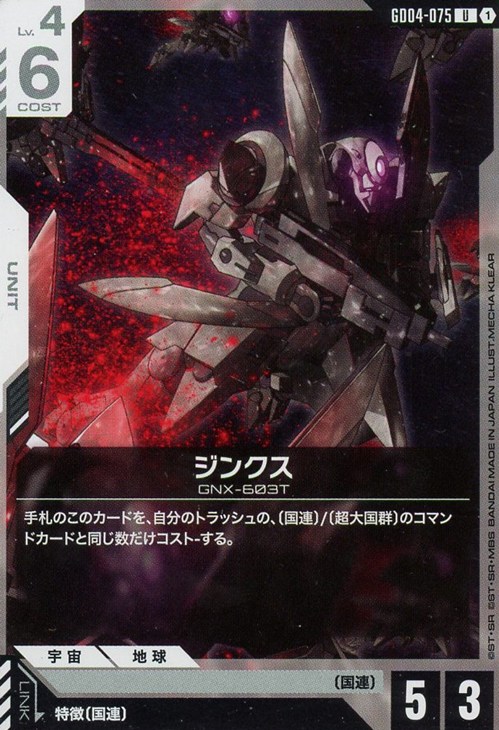 - 手札のこのカードを、自分のトラッシュの、〔国連〕/〔超大国群〕のコマンドカードと同じ数だけコスト-する。