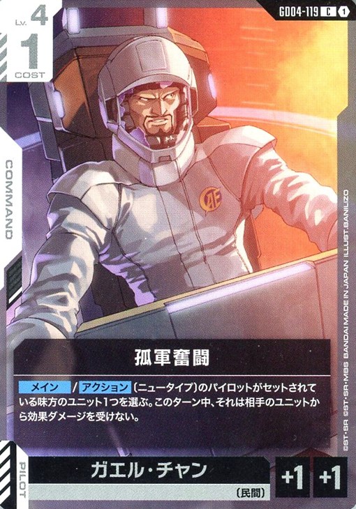 【メイン】/【アクション】〔ニュータイプ〕のパイロットがセットされている味方のユニット1つを選ぶ。このターン中、それは相手のユニットから効果ダメージを受けない。
