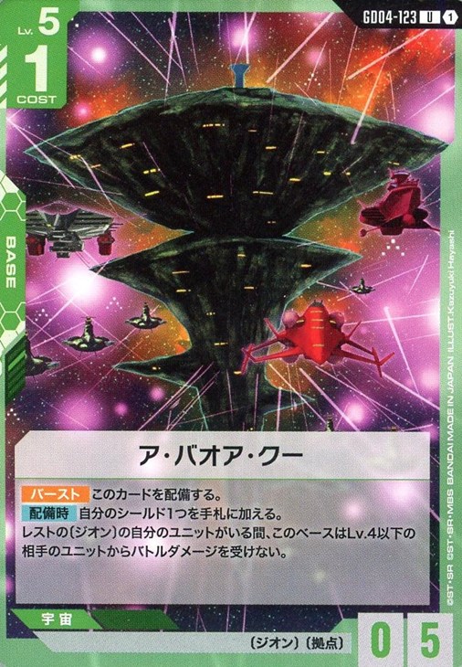 レストの〔ジオン〕の自分のユニットがいる間、このベースはLv.4以下の相手のユニットからバトルダメージを受けない。