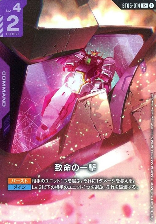 【バースト】相手のユニット1つを選ぶ。それに1ダメージを与える。【メイン】Lv.3以下の相手のユニット1つを選ぶ。それを破壊する。