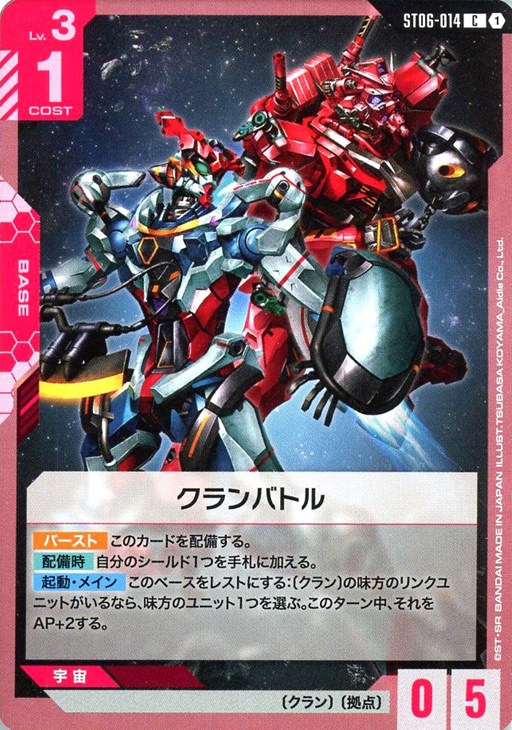 【バースト】このカードを配備する。【配備時】自分のシールド1つを手札に加える。【起動・メイン】このベースをレストにする:〔クラン〕の味方のリンクユニットがいるなら、味方のユニット1つを選ぶ。このターン中、それをAP+2する。