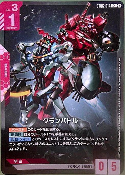 【バースト】このカードを配備する。【配備時】自分のシールド1つを手札に加える。【起動・メイン】このベースをレストにする:〔クラン〕の味方のリンクユニットがいるなら、味方のユニット1つを選ぶ。このターン中、それをAP+2する。