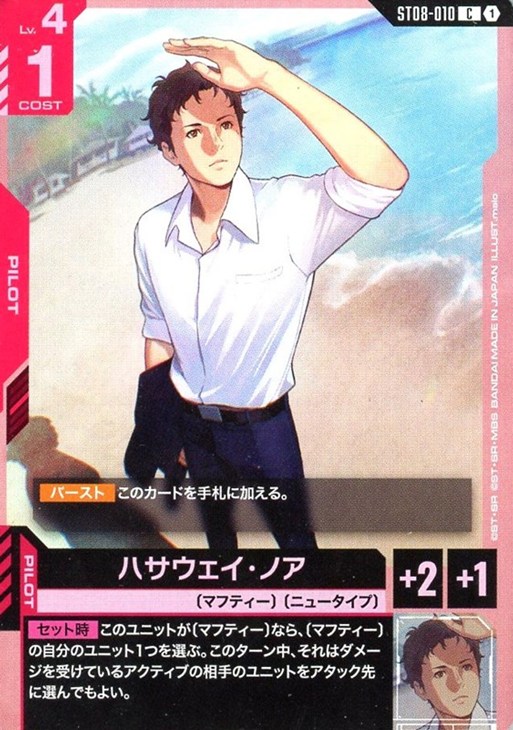 - 【バースト】このカードを手札に加える。【セット時】このユニットが〔マフティー〕なら、〔マフティー〕の自分のユニット1つを選ぶ。このターン中、それはダメージを受けているアクティブの相手のユニットをアタック先に選んでもよい。