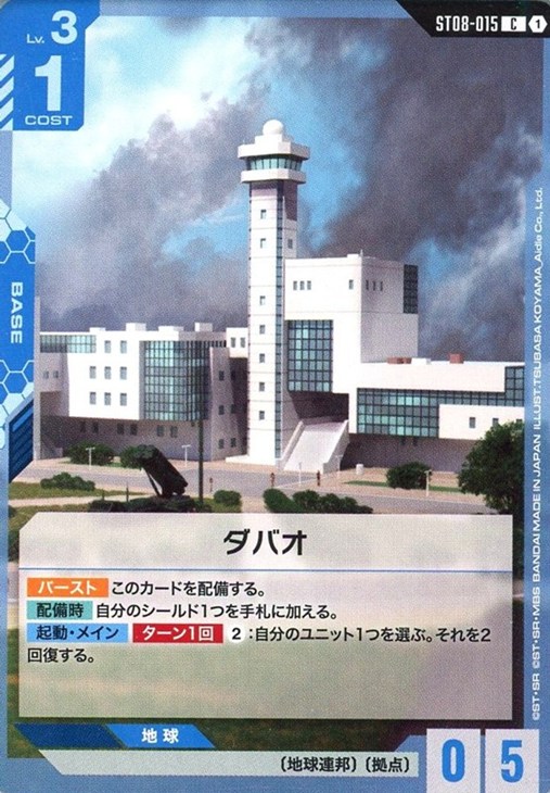 - 【バースト】このカードを配備する。【配備時】自分のシールド1つを手札に加える。【起動・メイン】【ターン1回】②:自分のユニット1つを選ぶ。それを2回復する。
