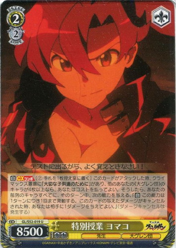 【自】CXコンボ〔②手札を1枚控え室に置く〕このカードがアタックした時、クライマックス置場に「大切な子供達のために」があり、他のあなたの〈大グレン団〉のキャラが4枚以上なら、あなたはコストを払ってよい。そうしたら、あなたの前列のキャラすべてに、そのターン中、次の能力を与える。「【自】この能力は1ターンにつき1回まで発動する。このカードの与えたダメージがキャンセルされた時、あなたは相手に1ダメージを与えてよい。」