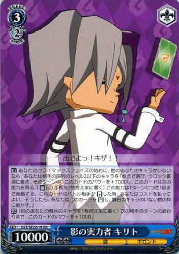- 【自】 あなたのクライマックスフェイズの始めに、他のあなたのキャラがいないなら、あなたは相手の前列のレベル3以下のキャラを1枚まで選び、クロック置場に置き、そのターン中、このカードのパワーを+7000し、このカードは次の能力を得る。『【自】[② 手札を2枚控え室に置く] この能力は1ターンにつき1回まで発動する。このカードのバトル相手がリバースした時、あなたはコストを払ってよい。そうしたら、あなたはこのカードをスタンドし、舞台のキャラのいない他の枠に動かす。』 【起】 [他のあなたの舞台のキャラを1枚控え室に置く] 次の相手のターンの終わりまで、このカードのパワーを+1000。