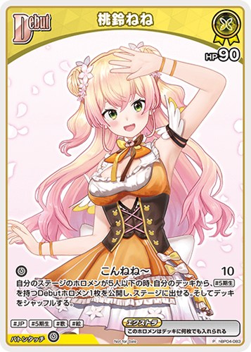 自分のステージのホロメンが5人以下の時、自分のデッキから、#5期生を持つDebutホロメン1枚を公開し、ステージに出せる。そしてデッキをシャッフルする。