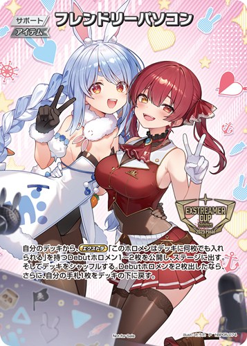 自分のデッキから、エクストラ「このホロメンはデッキに何枚でも入れられる」を持つDebutホロメン1~2枚を公開し、ステージに出す。そしてデッキをシャッフルする。Debutホロメンを2枚出したなら、さらに、自分の手札1枚をデッキの下に戻す。