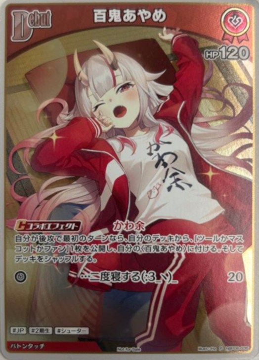 自分が後攻で最初のターンなら、自分のデッキから、[ツールかマスコットかファン]1枚を公開し、自分の〈百鬼あやめ〉に付ける。そしてデッキをシャッフルする。