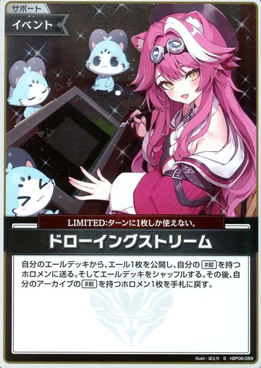 自分のエールデッキから、エール1枚を公開し、自分の#絵を持つホロメンに送る。そしてエールデッキをシャッフルする。その後、自分のアーカイブの#絵を持つホロメン1枚を手札に戻す。