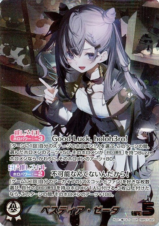 [ターンに1回]自分のステージのホロメン1人を選ぶ。このターンの間、選んだホロメンのアーツ+50。そのホロメンが#ID3期生を持つBuzzホロメンなら、かわりに、そのホロメンのアーツ+80。