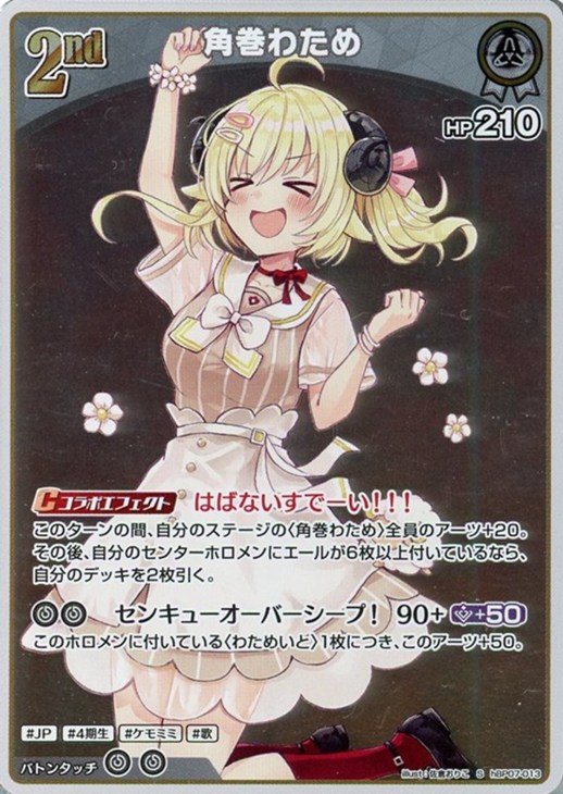 このターンの間、自分のステージの〈角巻わため〉全員のアーツ+20。その後、自分のセンターホロメンにエールが6枚以上付いているなら、自分のデッキを2枚引く。