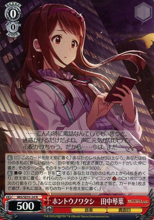 【起】[(1) このカードを控え室に置く] あなたのレベルが3以上なら、あなたは自分の手札の「新しい自分へ 田中琴葉」を1枚まで選び、このカードがいた枠に置き、そのターン中、そのキャラのパワーを+3000。