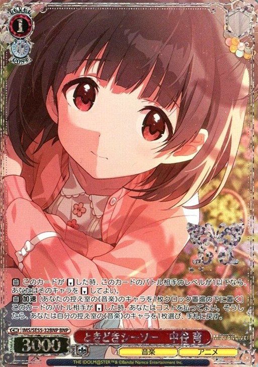 【自】 加速 [あなたの控え室の《音楽》のキャラを1枚クロック置場の下に置く] このカードのバトル相手が【リバース】した時、あなたはコストを払ってよい。そうしたら、あなたは自分の控え室の《音楽》のキャラを1枚選び、手札に戻す。
