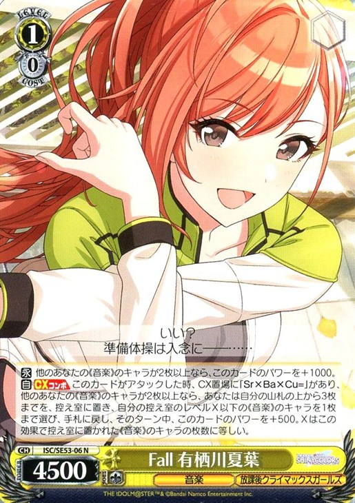【自】【CXコンボ】 このカードがアタックした時、CX置場に「Sr×Ba×Cu=」があり、他のあなたの《音楽》のキャラが2枚以上なら、あなたは自分の山札の上から3枚までを、控え室に置き、自分の控え室のレベルX以下の《音楽》のキャラを1枚まで選び、手札に戻し、そのターン中、このカードのパワーを+500。Xはこの効果で控え室に置かれた《音楽》のキャラの枚数に等しい。