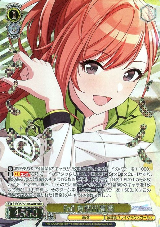 【自】【CXコンボ】 このカードがアタックした時、CX置場に「Sr×Ba×Cu=」があり、他のあなたの《音楽》のキャラが2枚以上なら、あなたは自分の山札の上から3枚までを、控え室に置き、自分の控え室のレベルX以下の《音楽》のキャラを1枚まで選び、手札に戻し、そのターン中、このカードのパワーを+500。Xはこの効果で控え室に置かれた《音楽》のキャラの枚数に等しい。