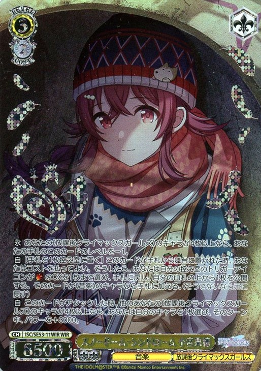 【自】 このカードがアタックした時、他のあなたの《放課後クライマックスガールズ》のキャラが4枚以上なら、あなたは自分のキャラを1枚選び、そのターン中、パワーを+3000。