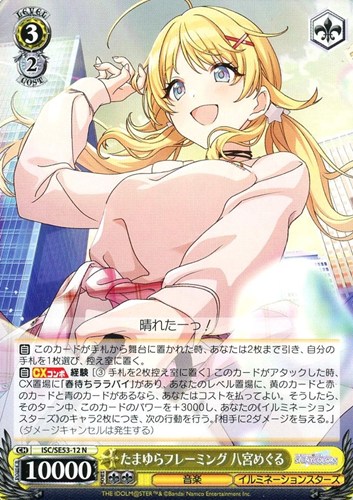 【自】【CXコンボ】 経験 [(3) 手札を2枚控え室に置く] このカードがアタックした時、CX置場に「春待ちララバイ」があり、あなたのレベル置場に、黄のカードと赤のカードと青のカードがあるなら、あなたはコストを払ってよい。そうしたら、そのターン中、このカードのパワーを+3000し、あなたの《イルミネーションスターズ》のキャラ2枚につき、次の行動を行う。『相手に2ダメージを与える。』(ダメージキャンセルは発生する)