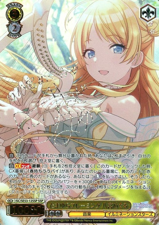 【自】【CXコンボ】 経験 [(3) 手札を2枚控え室に置く] このカードがアタックした時、CX置場に「春待ちララバイ」があり、あなたのレベル置場に、黄のカードと赤のカードと青のカードがあるなら、あなたはコストを払ってよい。そうしたら、そのターン中、このカードのパワーを+3000し、あなたの《イルミネーションスターズ》のキャラ2枚につき、次の行動を行う。『相手に2ダメージを与える。』(ダメージキャンセルは発生する)