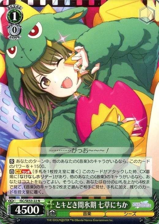 【自】【CXコンボ】[手札を1枚控え室に置く] このカードがアタックした時、CX置場に「なけなしホリデー」があり、他のあなたの《音楽》のキャラがいるなら、あなたはコストを払ってよい。そうしたら、あなたは自分の山札を上から4枚まで見て、《音楽》のキャラを2枚まで選んで相手に見せ、手札に加え、残りのカードを控え室に置く。