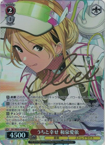 【自】 チェンジ [(2) このカードを控え室に置く] あなたのCXフェイズの始めに、あなたのレベルが2以上なら、あなたはコストを払ってよい。そうしたら、あなたは自分の手札の「メイ・ビー 和泉愛依」を1枚まで選び、このカードがいた枠に置き、そのターン中、そのキャラのパワーを+1000。