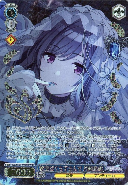 【自】【クロック】 アラーム このカードがクロックの1番上にあり、あなたの《音楽》のキャラが4枚以上なら、あなたのCXフェイズの始めに、あなたは自分のキャラを1枚選び、そのターン中、次の能力を与える。『【自】 このカードが【リバース】した時、このカードのバトル相手のレベルが相手のレベルより高いなら、あなたは相手のクロックの上から1枚を、控え室に置いてよい。そうしたら、あなたはそのキャラをクロック置場に置く。』