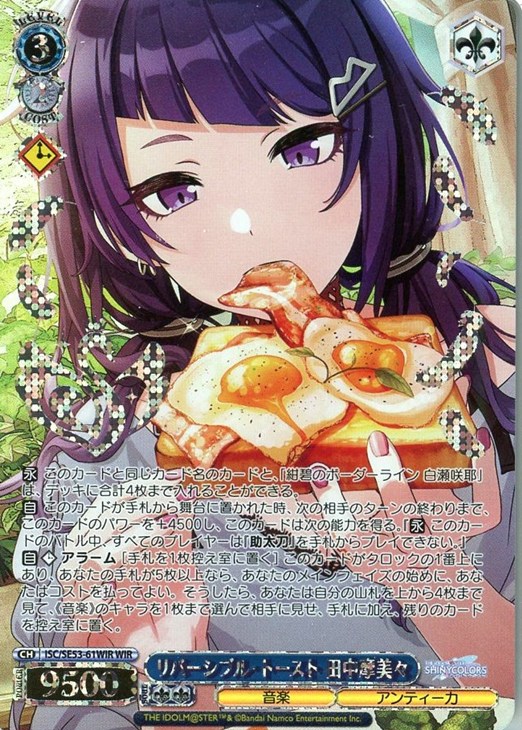 【自】【クロック】 アラーム [手札を1枚控え室に置く] このカードがクロックの1番上にあり、あなたの手札が5枚以上なら、あなたのメインフェイズの始めに、あなたはコストを払ってよい。そうしたら、あなたは自分の山札を上から4枚まで見て、《音楽》のキャラを1枚まで選んで相手に見せ、手札に加え、残りのカードを控え室に置く。
