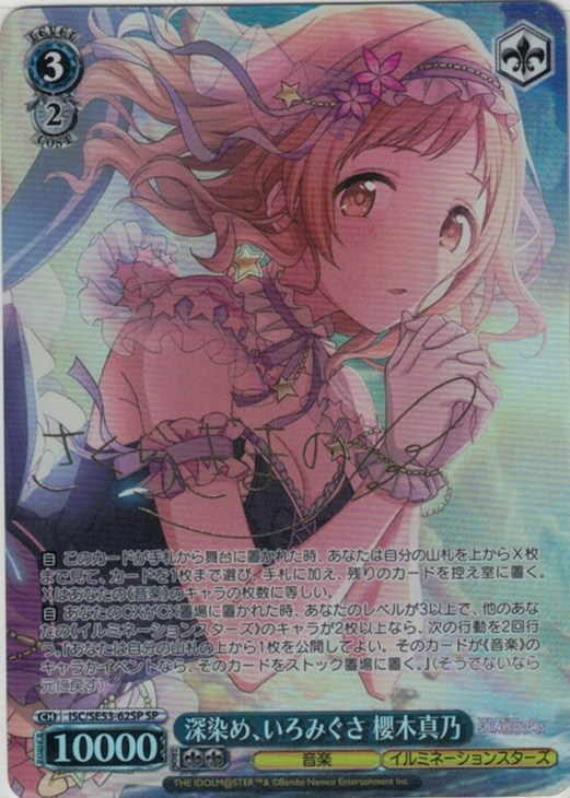 【自】 あなたのCXがCX置場に置かれた時、あなたのレベルが3以上で、他のあなたの《イルミネーションスターズ》のキャラが2枚以上なら、次の行動を2回行う。『あなたは自分の山札の上から1枚を公開してよい。そのカードが《音楽》のキャラかイベントなら、そのカードをストック置場に置く。』(そうでないなら元に戻す)