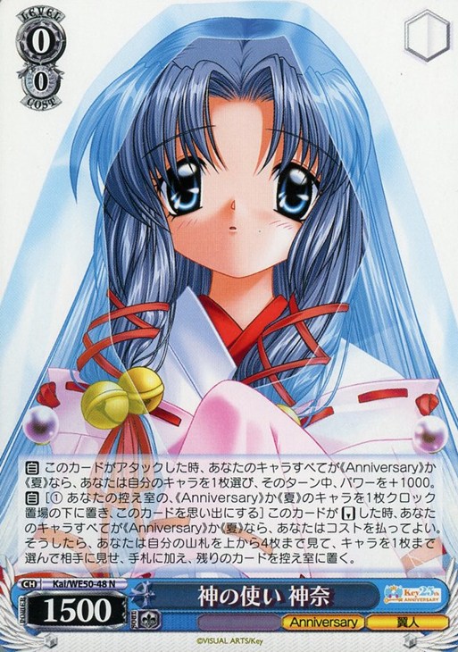 【自】[(1) あなたの控え室の、《Anniversary》か《夏》のキャラを1枚クロック置場の下に置き、このカードを思い出にする] このカードが【リバース】した時、あなたのキャラすべてが《Anniversary》か《夏》なら、あなたはコストを払ってよい。そうしたら、あなたは自分の山札を上から4枚まで見て、キャラを1枚まで選んで相手に見せ、手札に加え、残りのカードを控え室に置く。