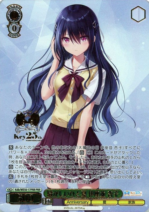 【自】 このカードが手札から舞台に置かれた時、あなたの思い出が2枚以下なら、あなたは自分の控え室の「遺されたメッセージ」を1枚選び、思い出にしてよい。