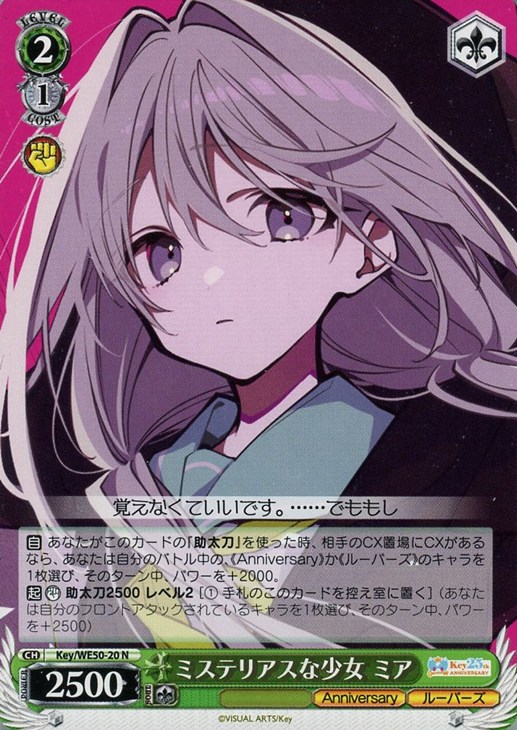 【自】 あなたがこのカードの『助太刀』を使った時、相手のCX置場にCXがあるなら、あなたは自分のバトル中の、《Anniversary》か《ルーパーズ》のキャラを1枚選び、そのターン中、パワーを+2000。