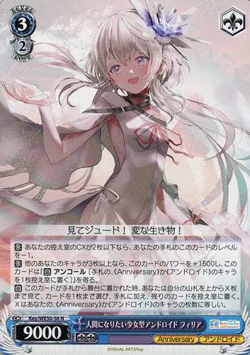 【自】 このカードが手札から舞台に置かれた時、あなたは自分の山札を上からX枚まで見て、カードを1枚まで選び、手札に加え、残りのカードを控え室に置く。Xはあなたの、《Anniversary》か《アンドロイド》のキャラの枚数に等しい。