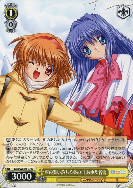 【自】[他のあなたの舞台の、《Anniversary》か《冬》のキャラを1枚控え室に置く] このカードがアタックした時、あなたはコストを払ってよい。そうしたら、あなたは自分の山札の上から1枚を公開する。そのカードが《Anniversary》か《冬》のキャラなら手札に加える。(そうでないなら元に戻す)