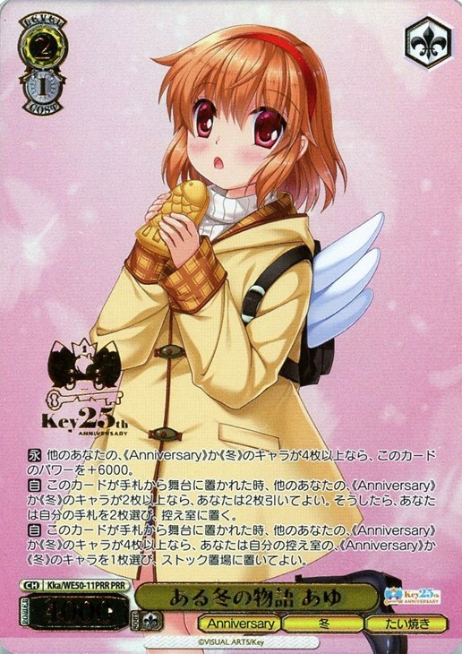 【自】 このカードが手札から舞台に置かれた時、他のあなたの、《Anniversary》か《冬》のキャラが4枚以上なら、あなたは自分の控え室の、《Anniversary》か《冬》のキャラを1枚選び、ストック置場に置いてよい。