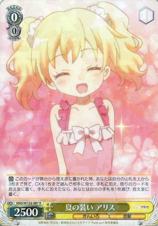 - 【自】 このカードが舞台から控え室に置かれた時、あなたは自分の山札を上から3枚まで見て、CXを1枚まで選んで相手に見せ、手札に加え、残りのカードを控え室に置く。手札に加えたなら、あなたは自分の手札を1枚選び、控え室に置く。