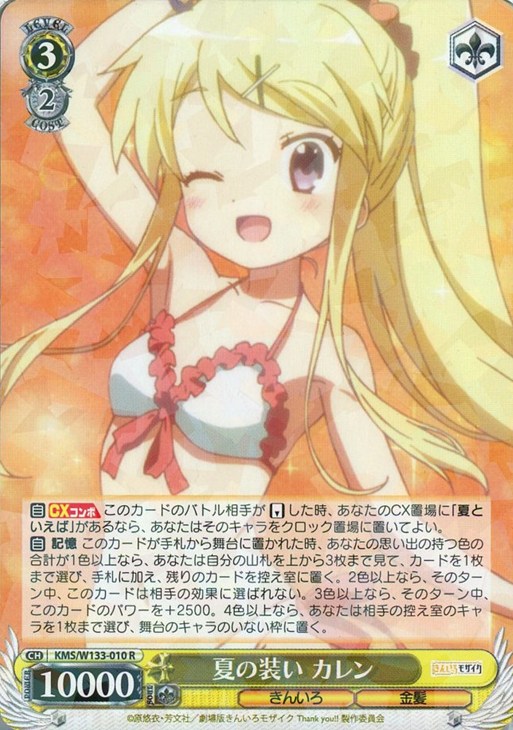 【自】 記憶 このカードが手札から舞台に置かれた時、あなたの思い出の持つ色の合計が1色以上なら、あなたは自分の山札を上から3枚まで見て、カードを1枚まで選び、手札に加え、残りのカードを控え室に置く。2色以上なら、そのターン中、このカードは相手の効果に選ばれない。3色以上なら、そのターン中、このカードのパワーを+2500。4色以上なら、あなたは相手の控え室のキャラを1枚まで選び、舞台のキャラのいない枠に置く。