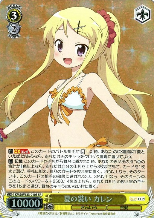 【自】 記憶 このカードが手札から舞台に置かれた時、あなたの思い出の持つ色の合計が1色以上なら、あなたは自分の山札を上から3枚まで見て、カードを1枚まで選び、手札に加え、残りのカードを控え室に置く。2色以上なら、そのターン中、このカードは相手の効果に選ばれない。3色以上なら、そのターン中、このカードのパワーを+2500。4色以上なら、あなたは相手の控え室のキャラを1枚まで選び、舞台のキャラのいない枠に置く。