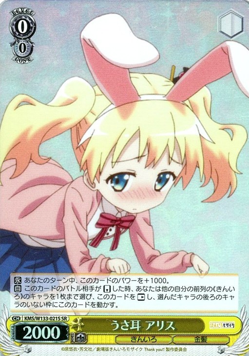 【自】 このカードのバトル相手が【リバース】した時、あなたは他の自分の前列の《きんいろ》のキャラを1枚まで選び、このカードを【レスト】し、選んだキャラの後ろのキャラのいない枠にこのカードを動かす。