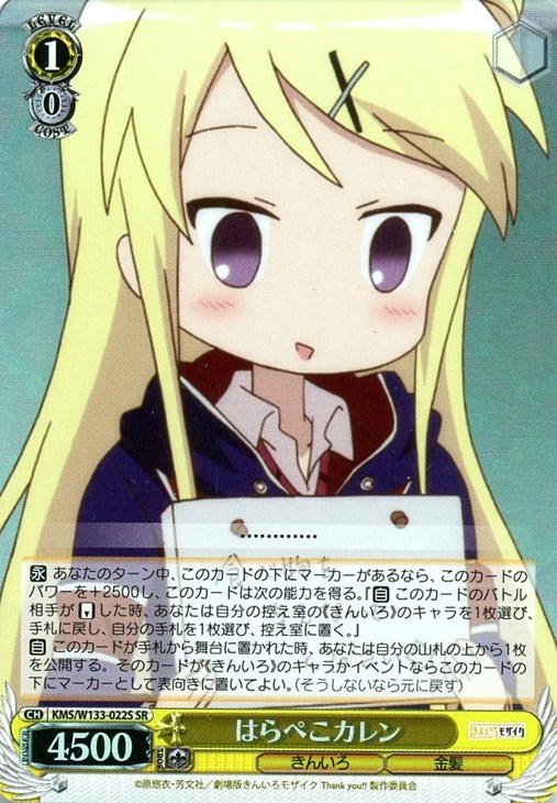 【自】 このカードが手札から舞台に置かれた時、あなたは自分の山札の上から1枚を公開する。そのカードが《きんいろ》のキャラかイベントならこのカードの下にマーカーとして表向きに置いてよい。(そうしないなら元に戻す)