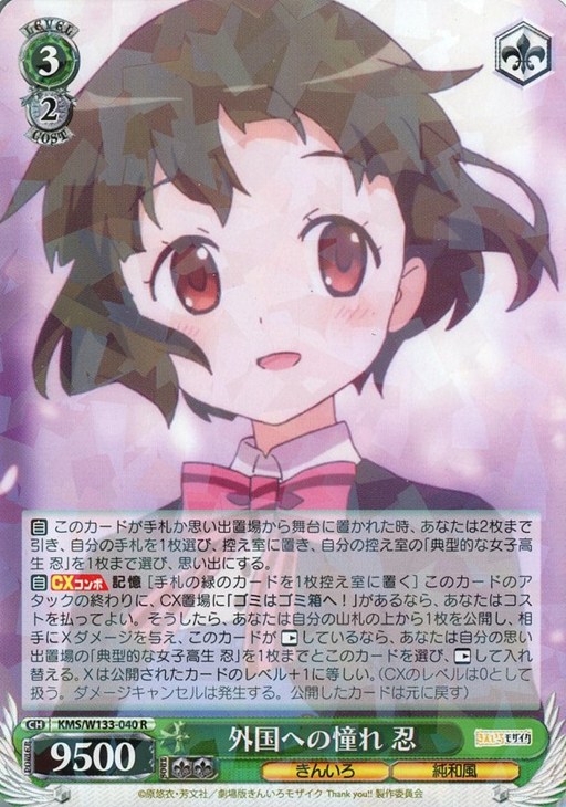 【自】【CXコンボ】 記憶 [手札の緑のカードを1枚控え室に置く] このカードのアタックの終わりに、CX置場に「ゴミはゴミ箱へ!」があるなら、あなたはコストを払ってよい。そうしたら、あなたは自分の山札の上から1枚を公開し、相手にXダメージを与え、このカードが【レスト】しているなら、あなたは自分の思い出置場の「典型的な女子高生 忍」を1枚までとこのカードを選び、【レスト】して入れ替える。Xは公開されたカードのレベル+1に等しい。(CXのレベルは0として扱う。ダメージキャンセルは発生する。公開したカードは元に戻す)