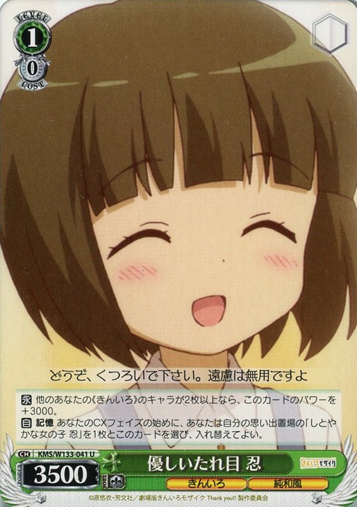 【自】 記憶 あなたのCXフェイズの始めに、あなたは自分の思い出置場の「しとやかな女の子 忍」を1枚とこのカードを選び、入れ替えてよい。