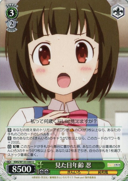 【自】 記憶 このカードが手札から舞台に置かれた時、あなたの思い出置場の《きんいろ》のキャラが3枚以上なら、あなたは2枚まで引き、自分の手札を1枚選び、ストック置場に置く。