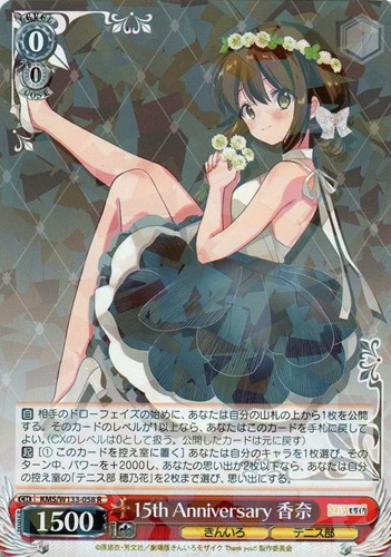 【起】[(1) このカードを控え室に置く] あなたは自分のキャラを1枚選び、そのターン中、パワーを+2000し、あなたの思い出が2枚以下なら、あなたは自分の控え室の「テニス部 穂乃花」を2枚まで選び、思い出にする。